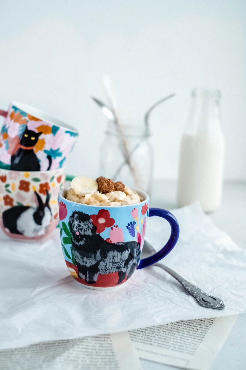 En la misma taza donde luego de cocinará en el microondas, Aplastar el guineo, si no está muy maduro se puede colocar por un minute en el microondas para ablandarlo. Añadir el aceite de coco fundido y la leche. Mezclar hasta incorporar. Agregar la harina de avena y el polvo para hornear. Batir con una espátula hasta que no haya grumos.