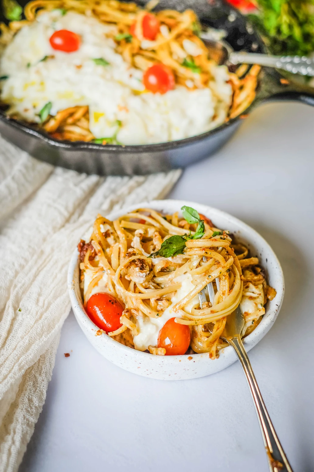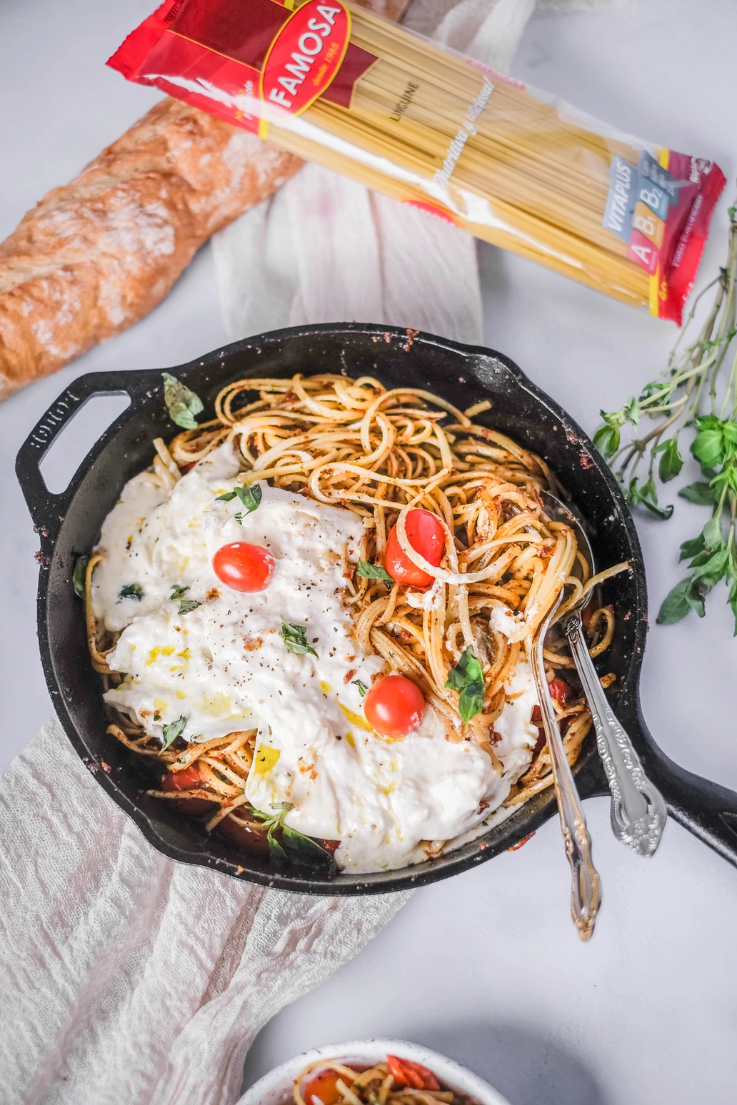 Volcamos los fideos en la sartén donde tenemos el pesto, colocar el queso burrata y abrirlo. Corregir la sal y agregar pimienta. LISTO. Servir sobre la misma sartén y disfrutar caliente!